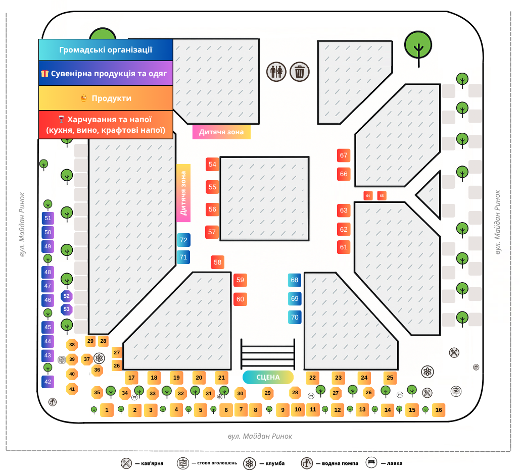 Ви можете забронювати місце на фестиваль-ярмарок натиснувши на схему розташування місць. Ви перейдете на сторінку бронювання. Зверніть увагу, що всі місця відповідають своїй категорії, для зручності ми присвоїли їм потрібні кольори.